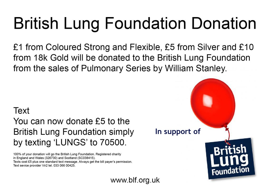 £1 FROM EACH SALE OF PULMONARY JEWELLERY SERIES IN COLOURED STRONG AND FLEXIBLE WILL BE DONATED TO THE BRITISH LUNG FOUNDATION.