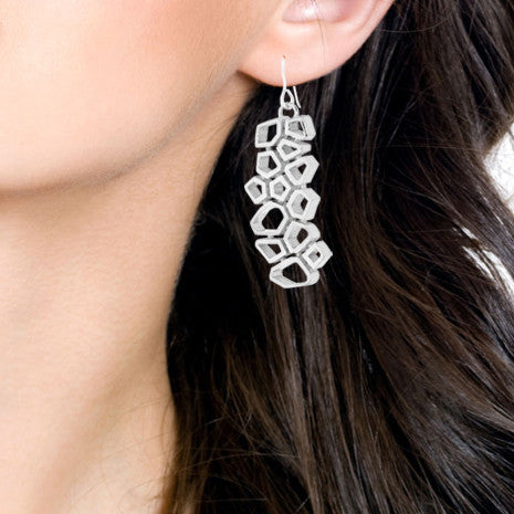 From the microarchitecture of our bones to leaves, dragonfly wings, turtles and giraffes, the voronoi pattern is found throughout many different parts of the natural world. 3D printed in wax, Voronoi Frame (S) is cast in plaster and then using the ancient lost wax process the wax is melted out leaving a cavity to pour in liquid silver. Once the silver has hardened the plaster is removed to reveal your finished earrings. Cleaned and polished these earrings exhibit the beauty and structural form of an often unseen part of our natural world.